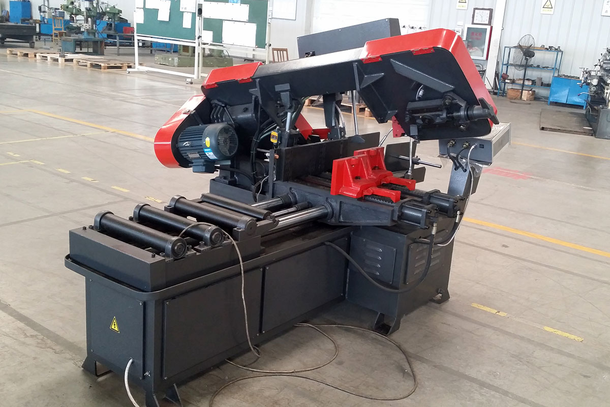 帶鋸條快速接近工件并自動轉(zhuǎn)入工進(jìn)鋸切速度,抬鋸高度隨工件大小自動調(diào)整,在自動循環(huán)過程中可省去很多空車時(shí)間。